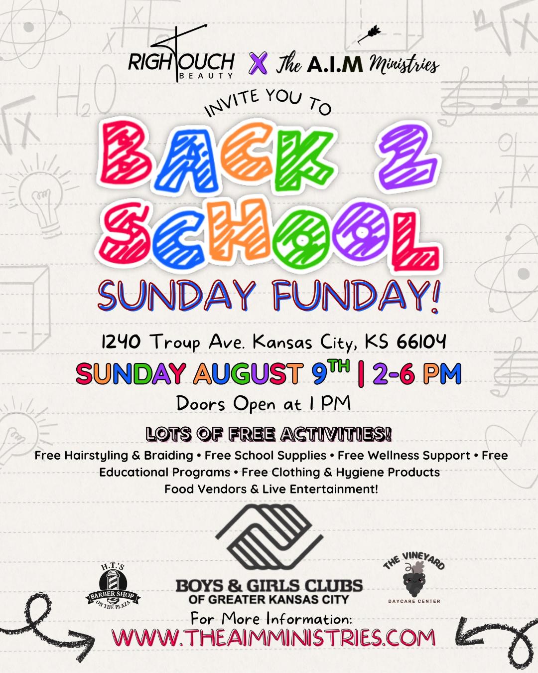 On behalf of Carrington Allen, Founder of The AIM Ministries, and RiKayla Watson, CEO of Right Touch Beauty, thank you for your support of our upcoming Back-To-School Sunday Funday, taking place on Sunday, August 9, 2026, from 2:00 PM to 6:00 PM (doors open at 1:00 PM) at 1240 Troup Avenue, Kansas City, KS 66101 in partnership with the Boys & Girls Club of Greater Kansas City.
